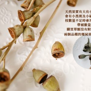 ✔品名:殭屍果 是尤加利果的一種, 有點像燈罩似的, 比一般尤加利果還瘦長, 出貨的時候不一定是一整枝, 有可能分兩枝+補果實來湊足數量呦。