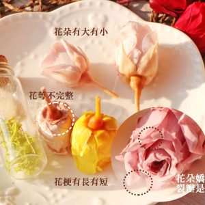 ● 每一朵不論大小或是花瓣都是獨一無二的,花萼方面可能偶有破瓣或不足瓣的情形,但都不會影響使用